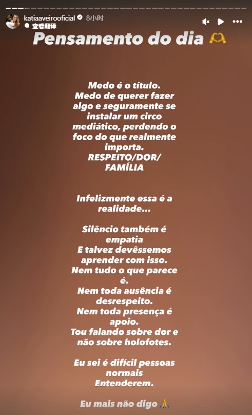 也许我们应该从中学习。并非所有的表象都是真相,并非所有的缺席都是不敬,并非所有的在场都是支持。我在谈论的是痛苦,而不是聚光灯。我知道普通人很难理解,我不会再多说了。”